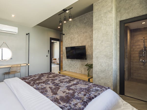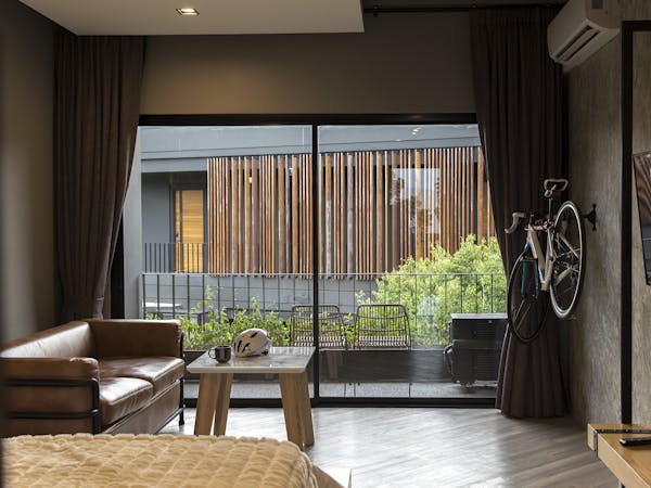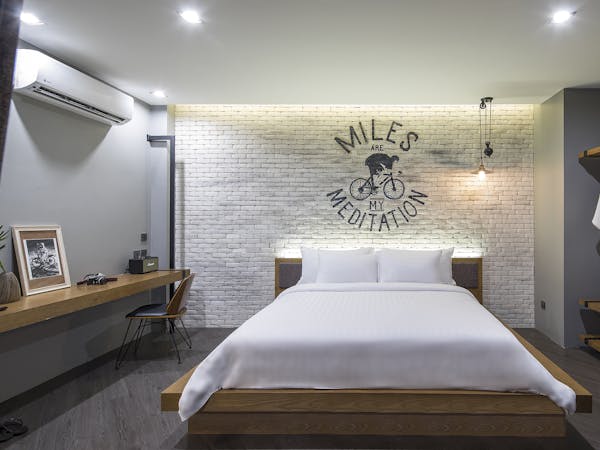 ห้องพักขนาด 23.3 ตร.ม. แบบ 1 ห้องนอน 1 ห้องน้ำ ดีไซน์ลอฟท์ในคอนเซ็ปต์ “มอเตอร์ไซค์บิ๊กไบค์” สะท้อนเอกลักษณ์ของ Wheeler Bed & Bike ด้วยโทนสีเทา-ดำและวัสดุปูนเปลือย ผสมไม้ธรรมชาติ ให้ความรู้สึกเท่ ดิบ และอบอุ่นในเวลาเดียวกัน เหมาะสำหรับนักเดินทางเดี่ยวหรือคู่รักที่ชื่นชอบดีไซน์มีสไตล์และอยู่ใกล้ชายหาดบางแสน