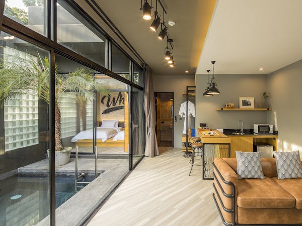 วิลล่าส่วนตัวขนาด 64 ตร.ม. แบบ 1 ห้องนอน 1 ห้องน้ำ 1 ห้องนั่งเล่น พร้อมสระว่ายน้ำส่วนตัว เหมาะสำหรับคู่รักที่ต้องการความสงบและโรแมนติก ภายในตกแต่งสไตล์มินิมอลผสมลอฟท์ มีมุมนั่งเล่นสบาย ๆ มองเห็นวิวสระน้ำ ให้บรรยากาศผ่อนคลายเหมือนรีสอร์ตส่วนตัวใกล้ชายหาดบางแสน