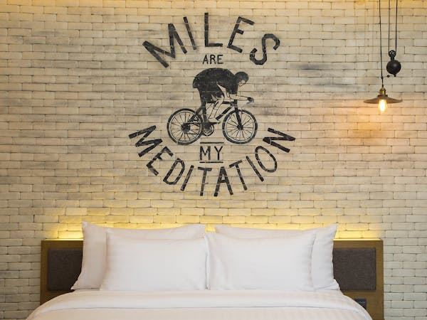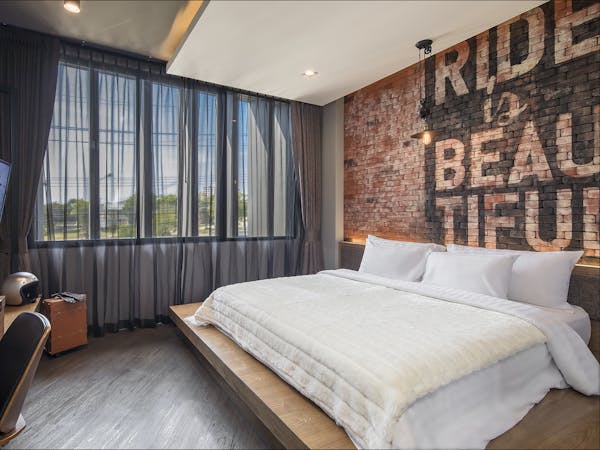 ห้องพักขนาด 37 ตร.ม. แบบ 1 ห้องนอน 1 ห้องน้ำ ดีไซน์ลอฟท์ในคอนเซ็ปต์ “มอเตอร์ไซค์บิ๊กไบค์” สะท้อนเอกลักษณ์ของ Wheeler Bed & Bike ด้วยโทนสีเทา-ดำและวัสดุปูนเปลือย ผสมไม้ธรรมชาติ ให้ความรู้สึกเท่ ดิบ และอบอุ่นในเวลาเดียวกัน เหมาะสำหรับนักเดินทางเดี่ยวหรือคู่รักที่ชื่นชอบดีไซน์มีสไตล์และอยู่ใกล้ชายหาดบางแสน
