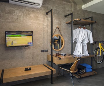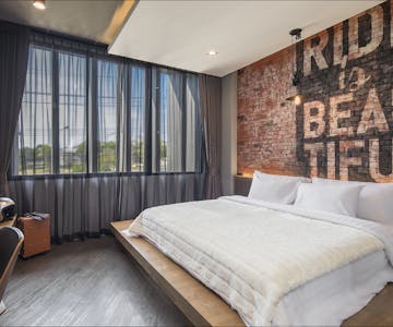 ห้องพักขนาด 23.3 ตร.ม. แบบ 1 ห้องนอน 1 ห้องน้ำ ดีไซน์ลอฟท์ในคอนเซ็ปต์ “มอเตอร์ไซค์บิ๊กไบค์” สะท้อนเอกลักษณ์ของ Wheeler Bed & Bike ด้วยโทนสีเทา-ดำและวัสดุปูนเปลือย ผสมไม้ธรรมชาติ ให้ความรู้สึกเท่ ดิบ และอบอุ่นในเวลาเดียวกัน เหมาะสำหรับนักเดินทางเดี่ยวหรือคู่รักที่ชื่นชอบดีไซน์มีสไตล์และอยู่ใกล้ชายหาดบางแสน