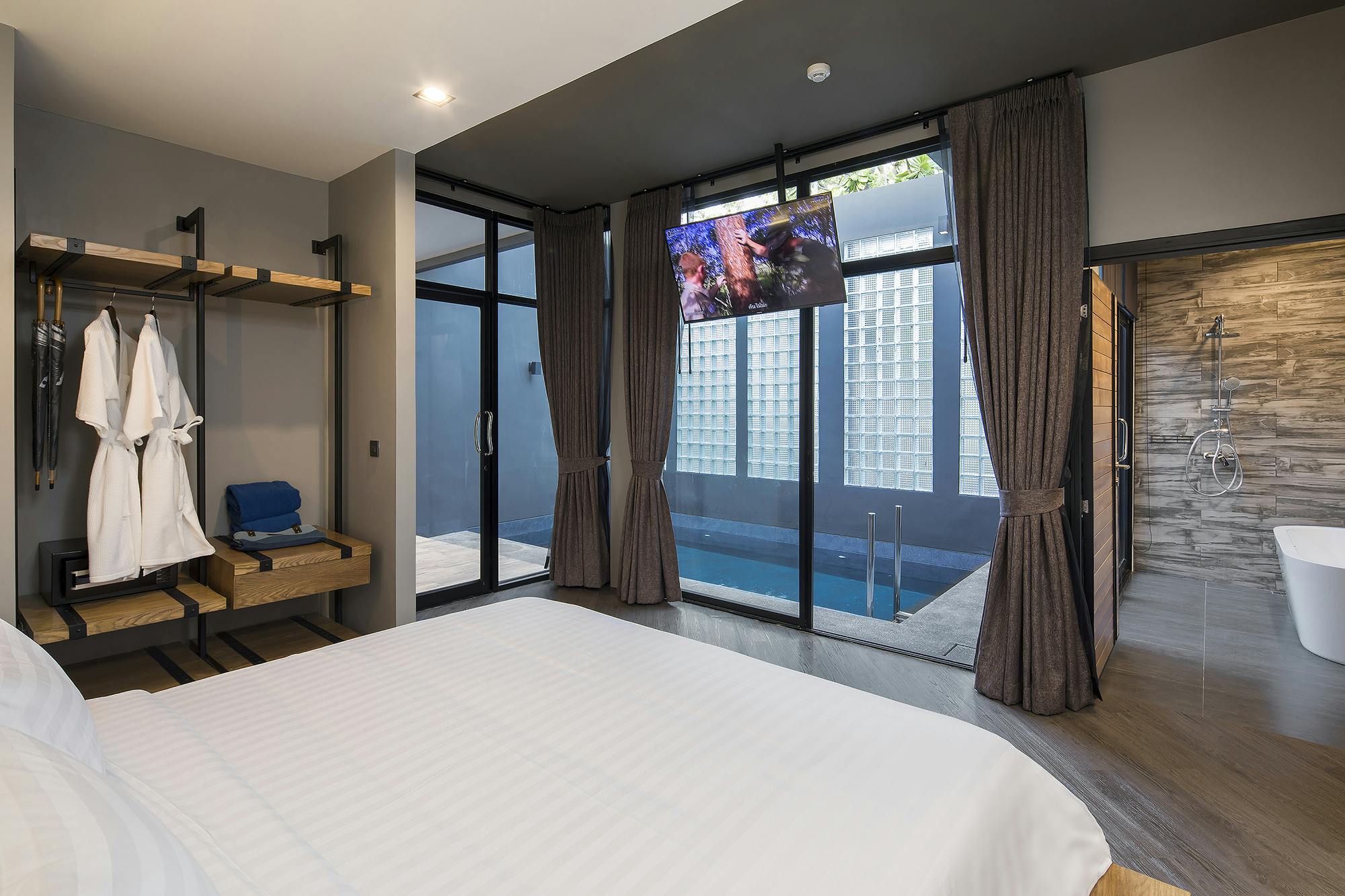 วิลล่าส่วนตัวขนาด 64 ตร.ม. แบบ 1 ห้องนอน 1 ห้องน้ำ 1 ห้องนั่งเล่น พร้อมสระว่ายน้ำส่วนตัว เหมาะสำหรับคู่รักที่ต้องการความสงบและโรแมนติก ภายในตกแต่งสไตล์มินิมอลผสมลอฟท์ มีมุมนั่งเล่นสบาย ๆ มองเห็นวิวสระน้ำ ให้บรรยากาศผ่อนคลายเหมือนรีสอร์ตส่วนตัวใกล้ชายหาดบางแสน