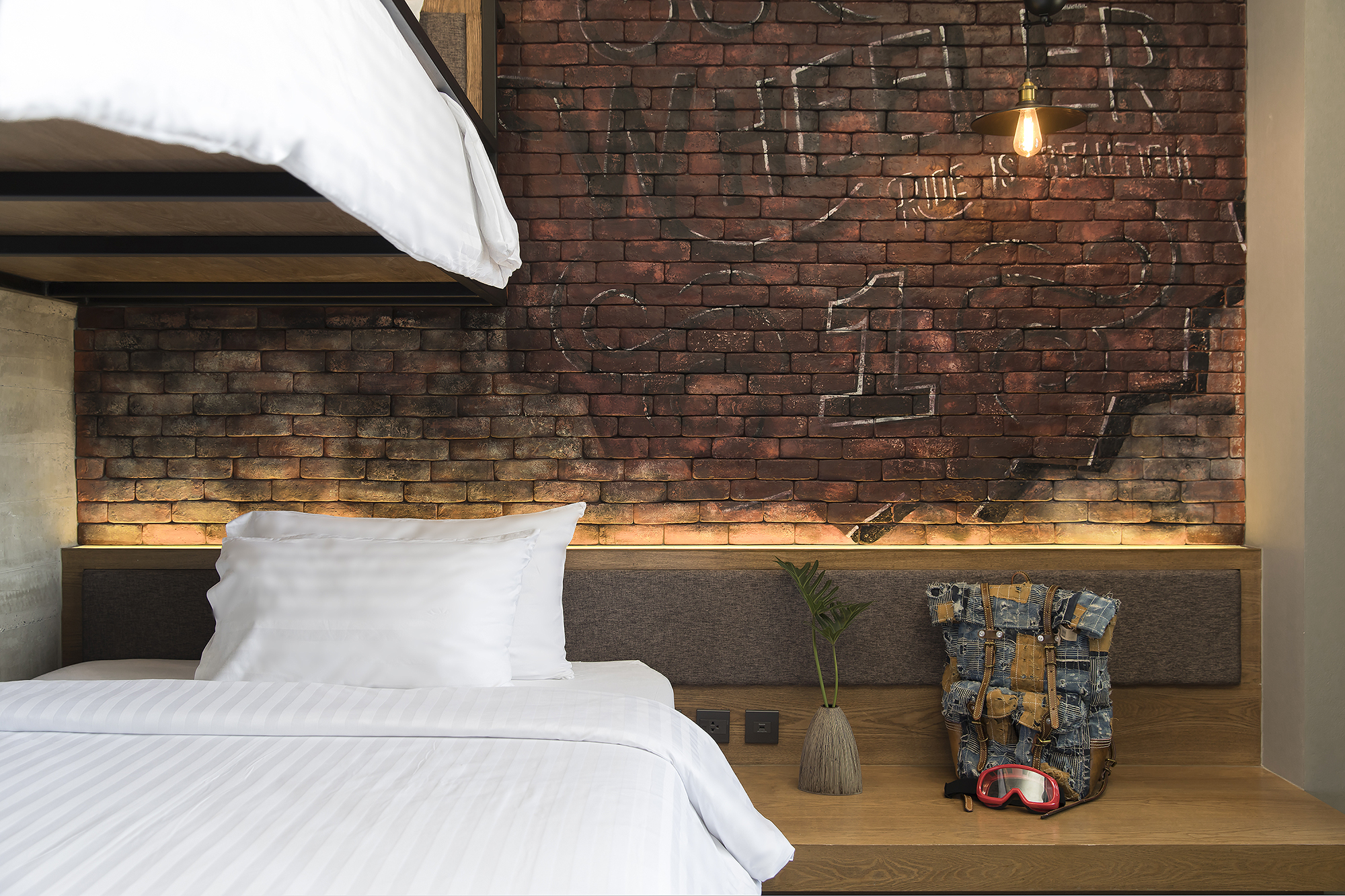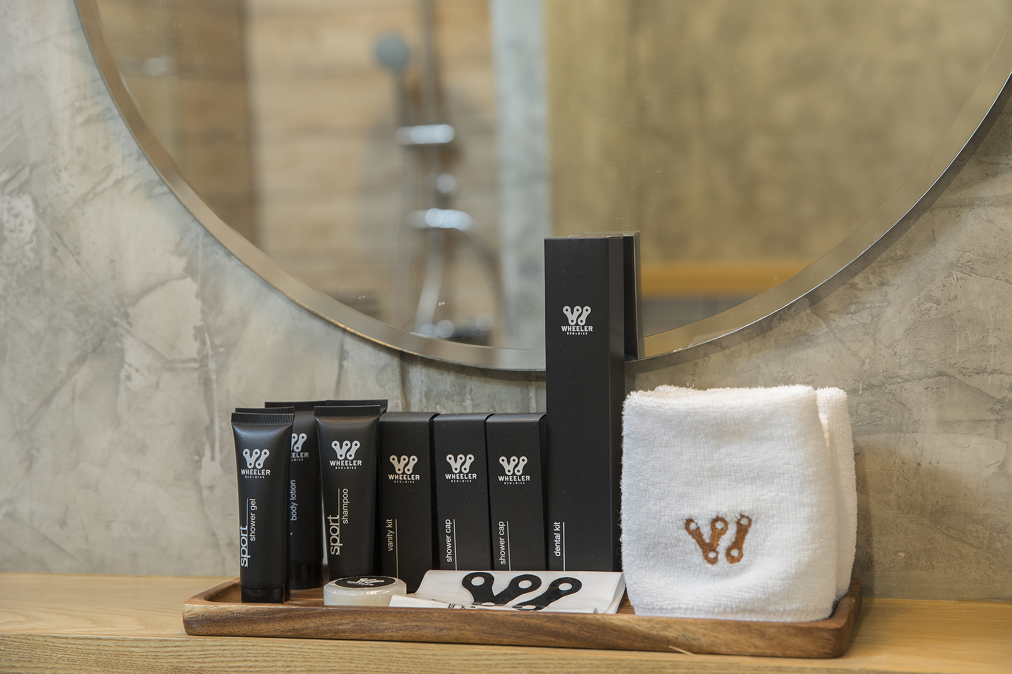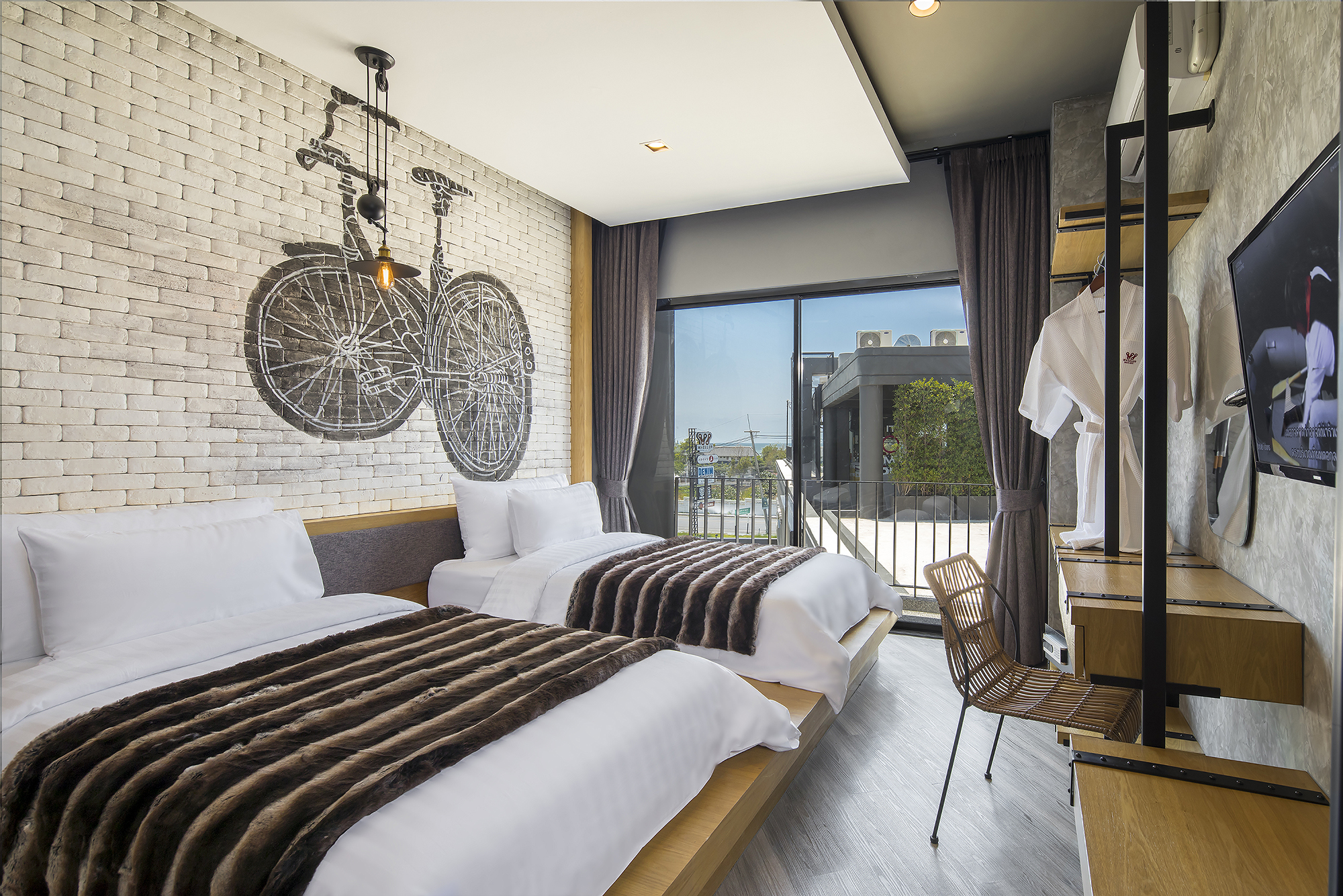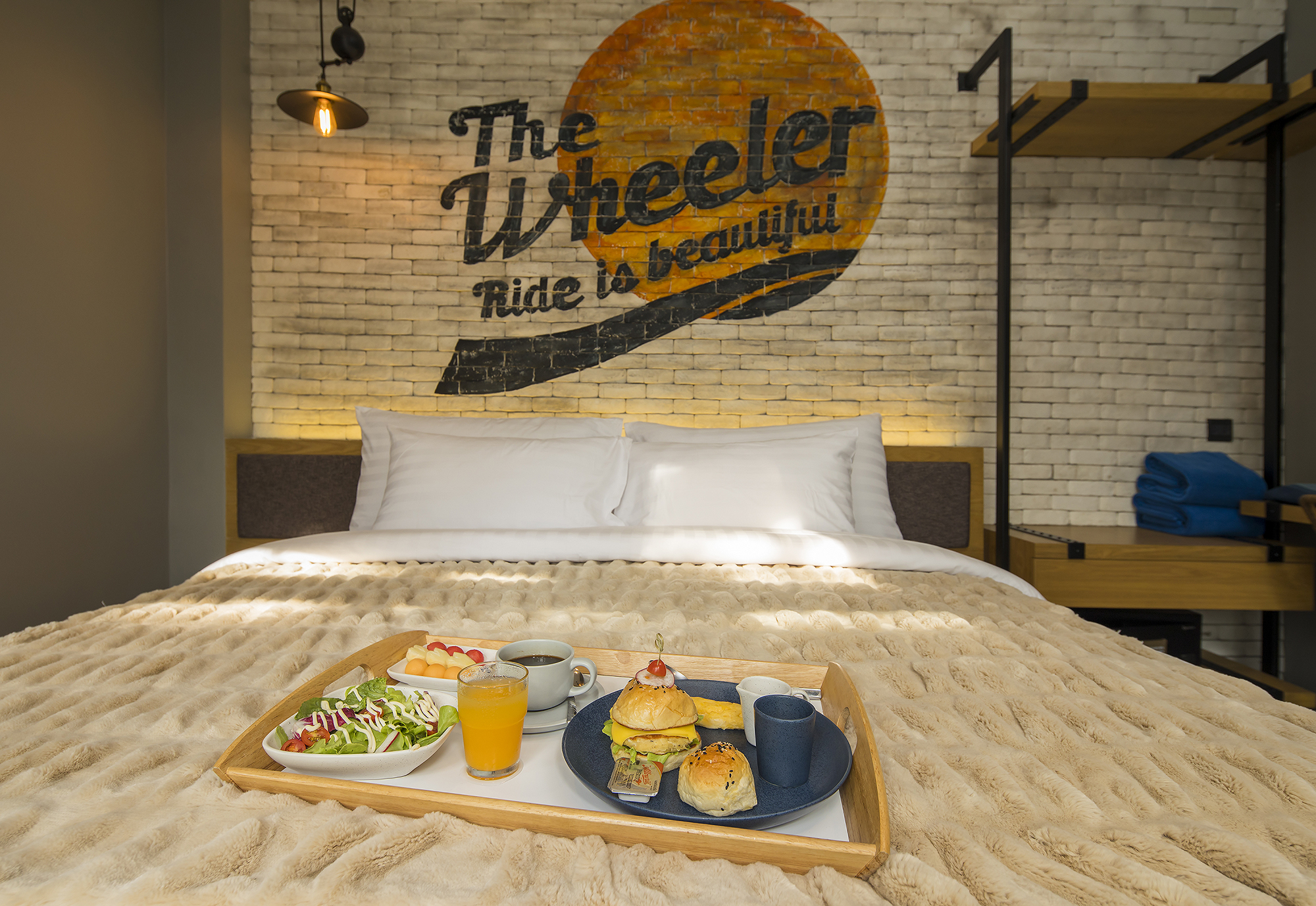 ห้องพักขนาด 23.3 ตร.ม. แบบ 1 ห้องนอน 1 ห้องน้ำ ดีไซน์ลอฟท์ในคอนเซ็ปต์ “มอเตอร์ไซค์บิ๊กไบค์” สะท้อนเอกลักษณ์ของ Wheeler Bed & Bike ด้วยโทนสีเทา-ดำและวัสดุปูนเปลือย ผสมไม้ธรรมชาติ ให้ความรู้สึกเท่ ดิบ และอบอุ่นในเวลาเดียวกัน เหมาะสำหรับนักเดินทางเดี่ยวหรือคู่รักที่ชื่นชอบดีไซน์มีสไตล์และอยู่ใกล้ชายหาดบางแสน