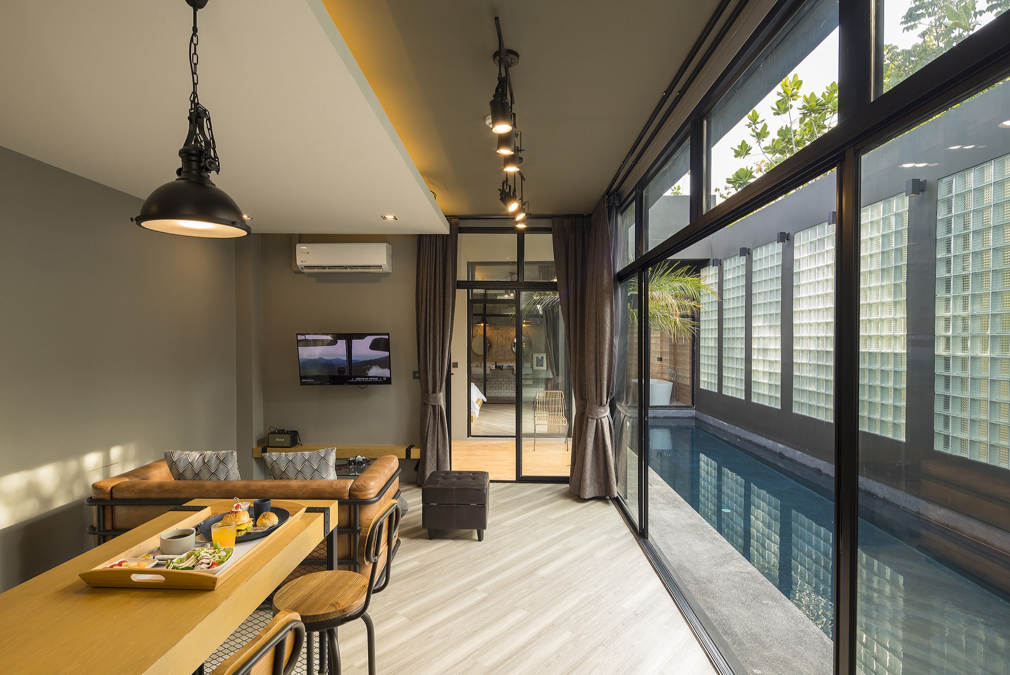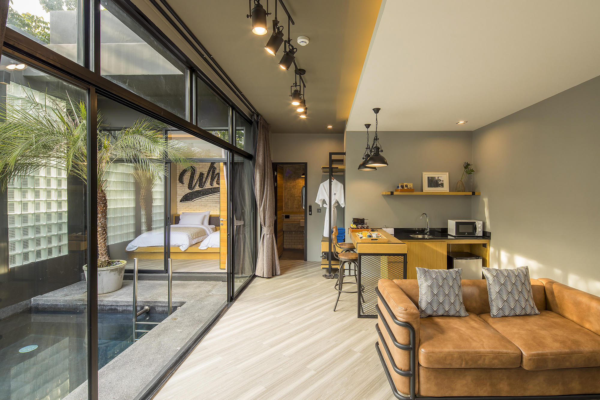 วิลล่าส่วนตัวขนาด 64 ตร.ม. แบบ 1 ห้องนอน 1 ห้องน้ำ 1 ห้องนั่งเล่น พร้อมสระว่ายน้ำส่วนตัว เหมาะสำหรับคู่รักที่ต้องการความสงบและโรแมนติก ภายในตกแต่งสไตล์มินิมอลผสมลอฟท์ มีมุมนั่งเล่นสบาย ๆ มองเห็นวิวสระน้ำ ให้บรรยากาศผ่อนคลายเหมือนรีสอร์ตส่วนตัวใกล้ชายหาดบางแสน