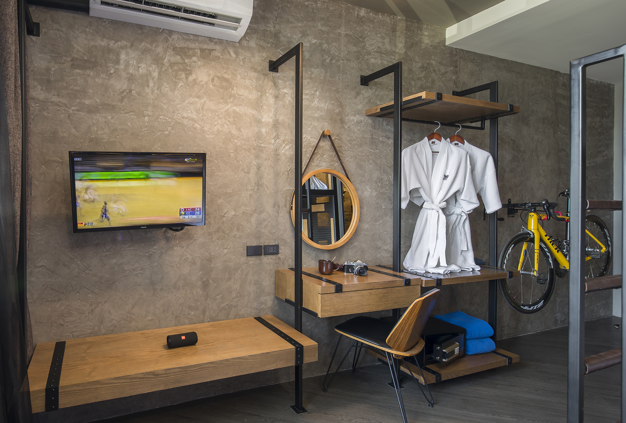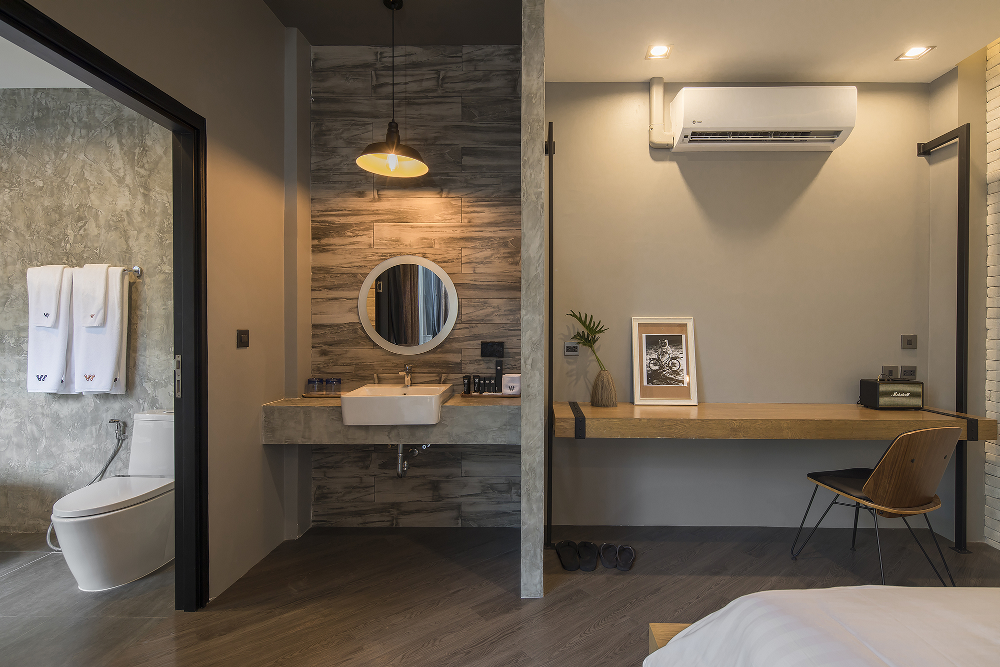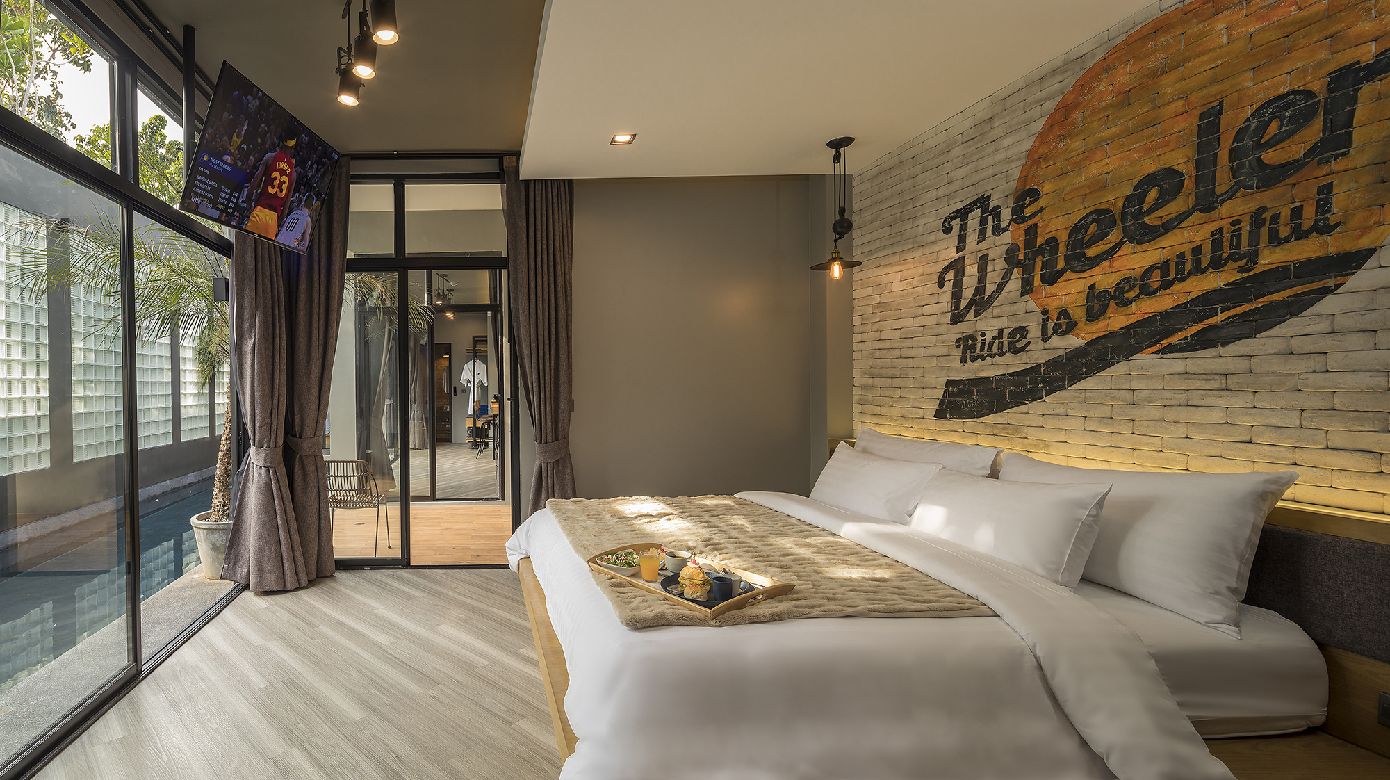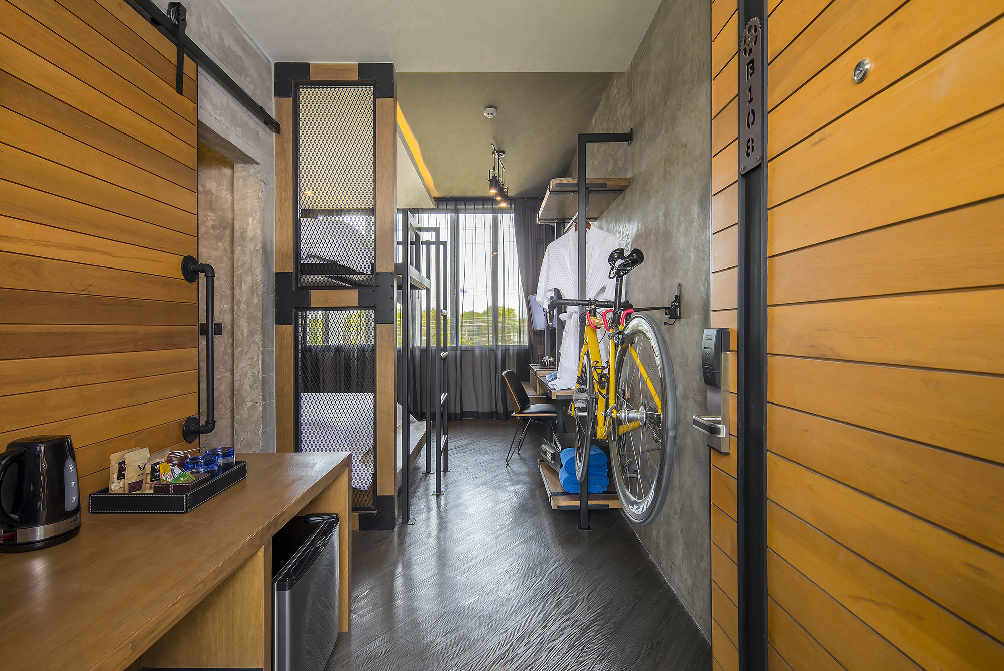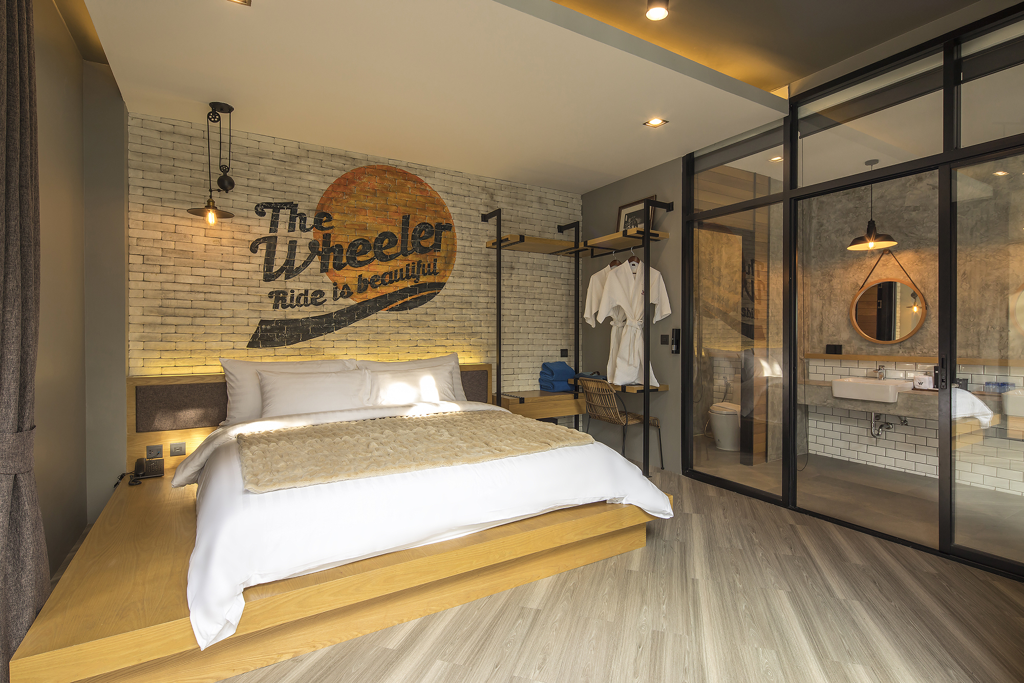 ห้องพักขนาด 37 ตร.ม. แบบ 1 ห้องนอน 1 ห้องน้ำ ดีไซน์ลอฟท์ในคอนเซ็ปต์ “มอเตอร์ไซค์บิ๊กไบค์” สะท้อนเอกลักษณ์ของ Wheeler Bed & Bike ด้วยโทนสีเทา-ดำและวัสดุปูนเปลือย ผสมไม้ธรรมชาติ ให้ความรู้สึกเท่ ดิบ และอบอุ่นในเวลาเดียวกัน เหมาะสำหรับนักเดินทางเดี่ยวหรือคู่รักที่ชื่นชอบดีไซน์มีสไตล์และอยู่ใกล้ชายหาดบางแสน
