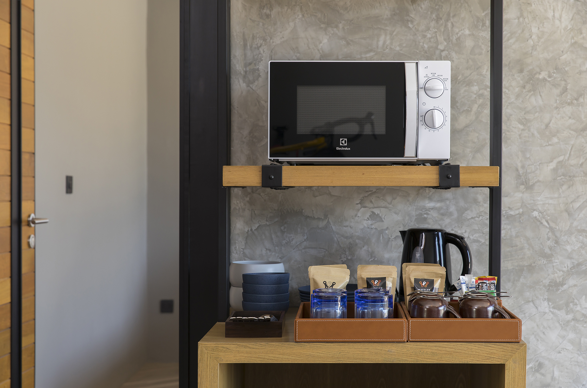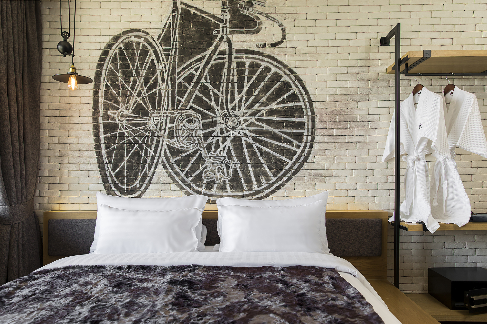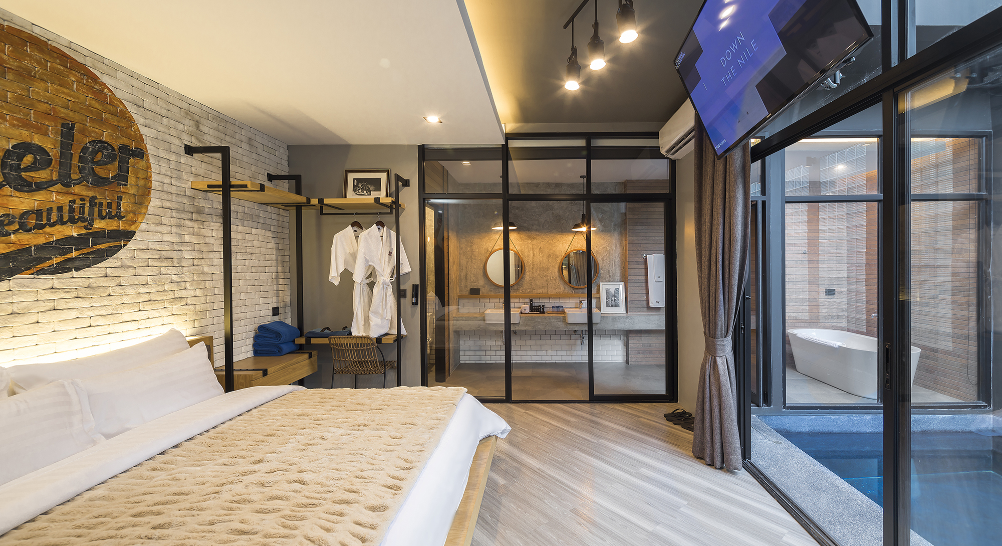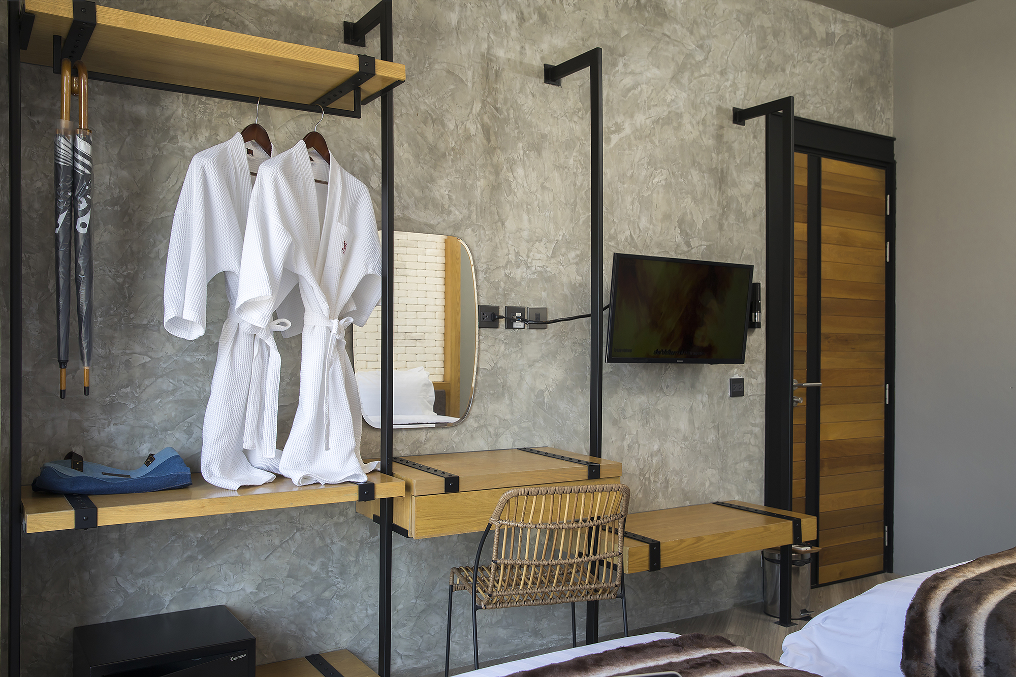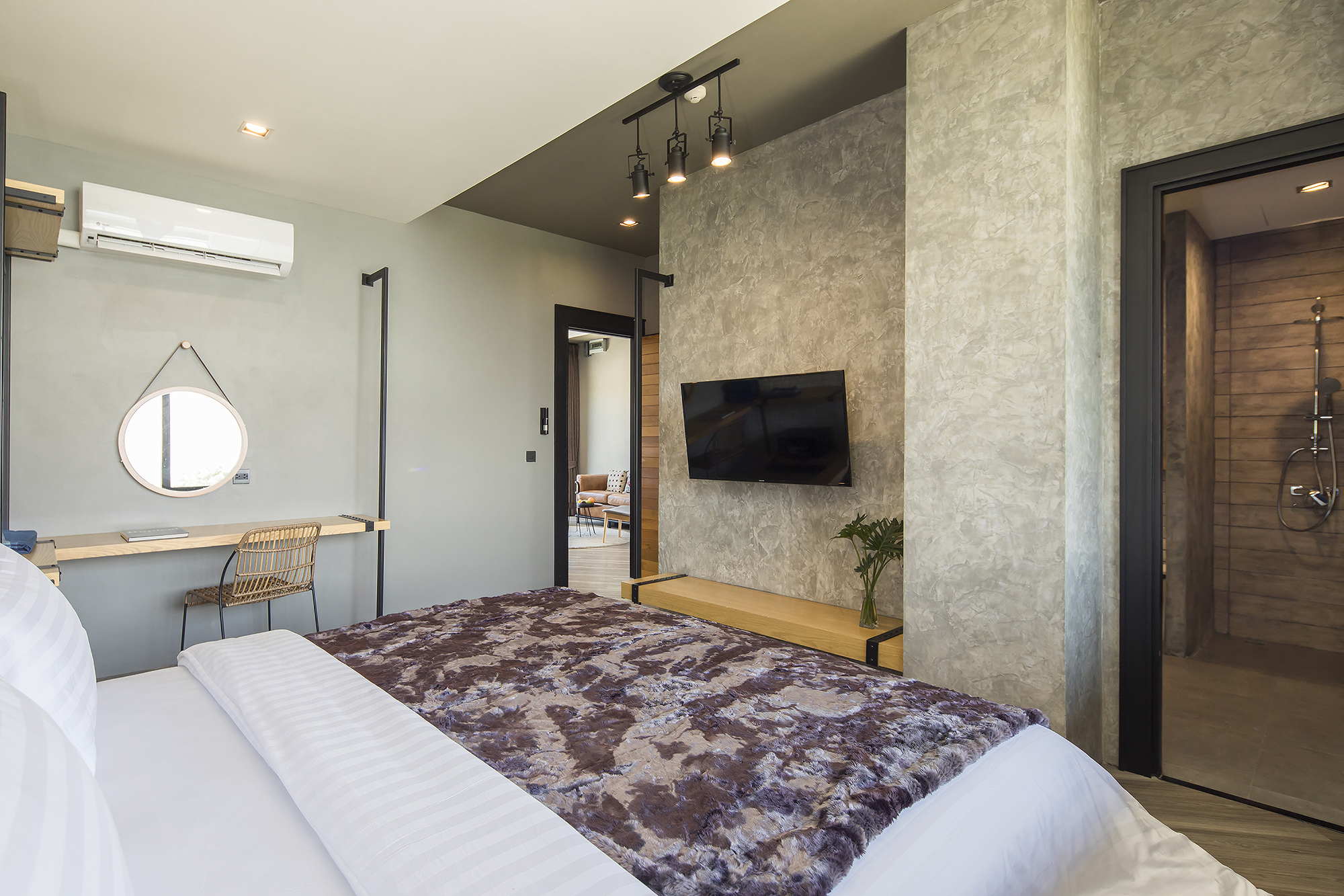 ห้องพักขนาด 37 ตร.ม. แบบ 1 ห้องนอน 1 ห้องน้ำ ดีไซน์ลอฟท์ในคอนเซ็ปต์ “มอเตอร์ไซค์บิ๊กไบค์” สะท้อนเอกลักษณ์ของ Wheeler Bed & Bike ด้วยโทนสีเทา-ดำและวัสดุปูนเปลือย ผสมไม้ธรรมชาติ ให้ความรู้สึกเท่ ดิบ และอบอุ่นในเวลาเดียวกัน เหมาะสำหรับนักเดินทางเดี่ยวหรือคู่รักที่ชื่นชอบดีไซน์มีสไตล์และอยู่ใกล้ชายหาดบางแสน