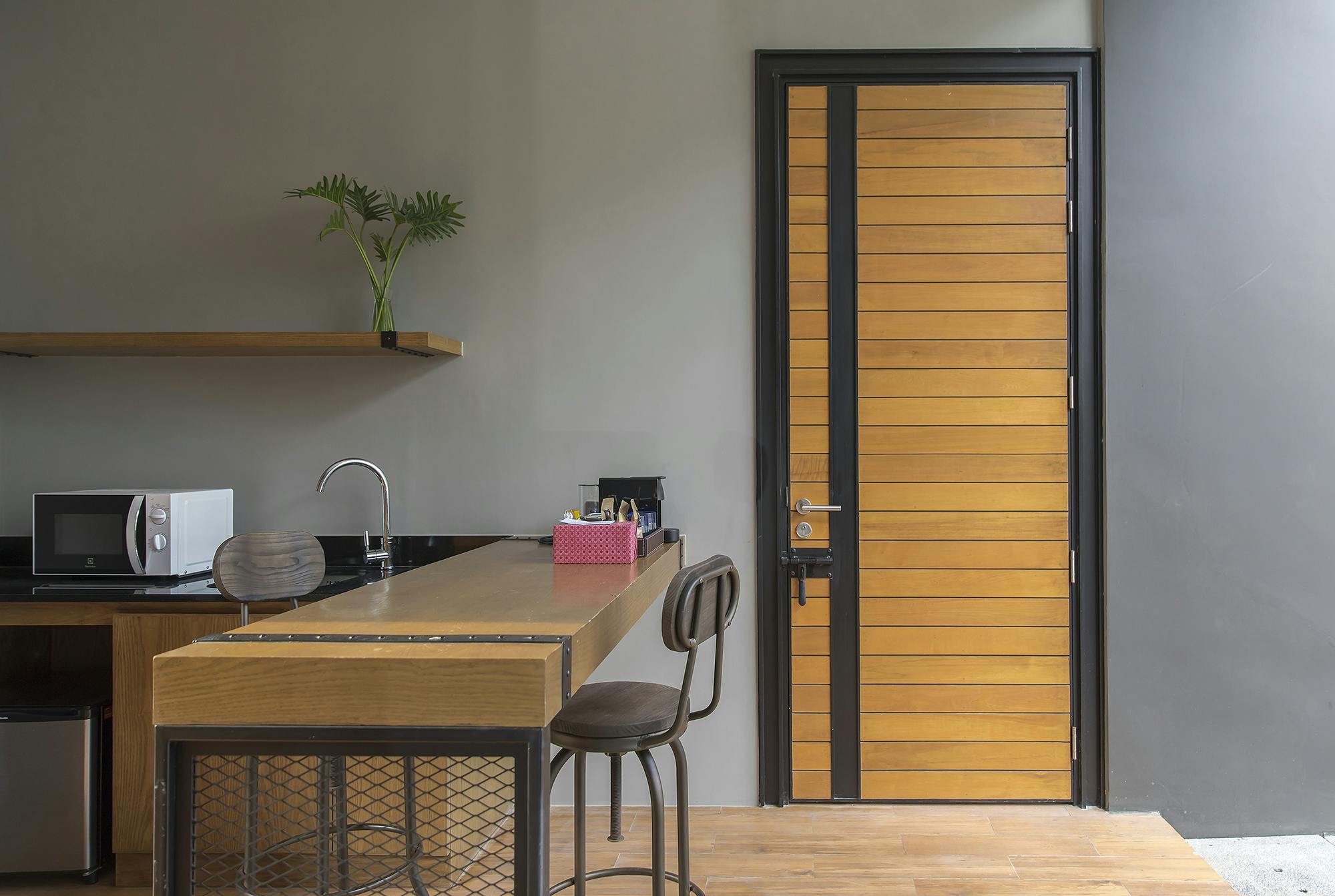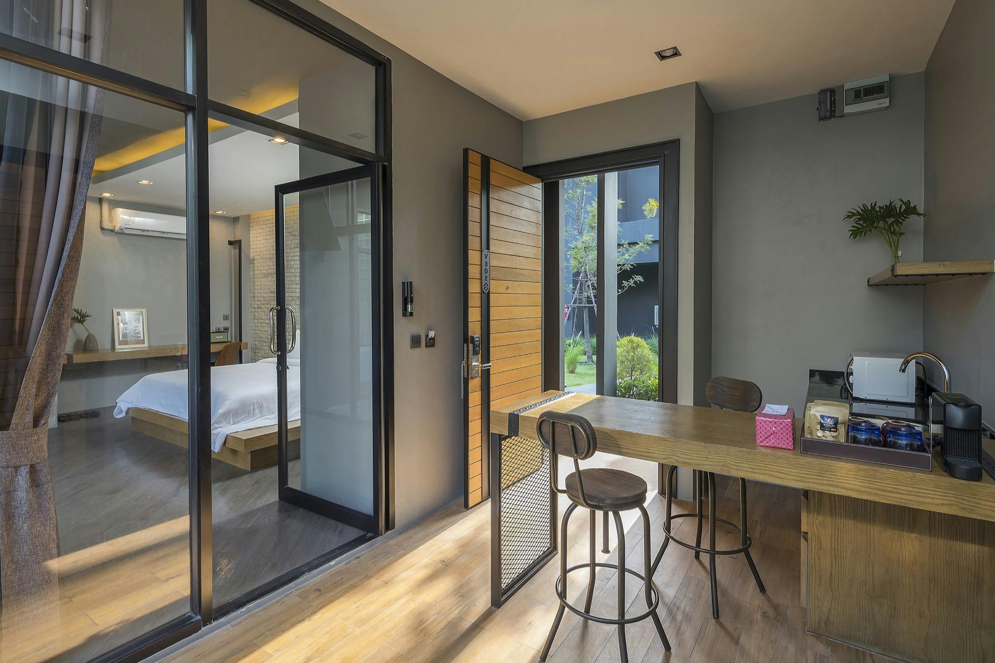 วิลล่าส่วนตัวขนาด 64 ตร.ม. แบบ 1 ห้องนอน 1 ห้องน้ำ 1 ห้องนั่งเล่น พร้อมสระว่ายน้ำส่วนตัว เหมาะสำหรับคู่รักที่ต้องการความสงบและโรแมนติก ภายในตกแต่งสไตล์มินิมอลผสมลอฟท์ มีมุมนั่งเล่นสบาย ๆ มองเห็นวิวสระน้ำ ให้บรรยากาศผ่อนคลายเหมือนรีสอร์ตส่วนตัวใกล้ชายหาดบางแสน